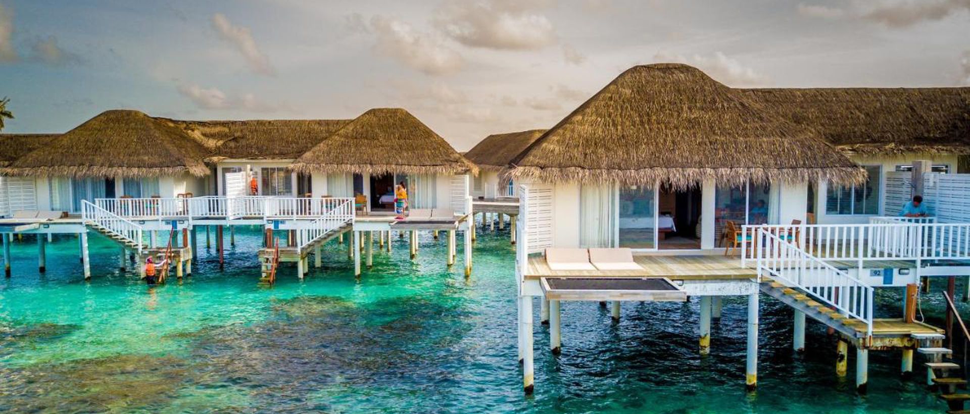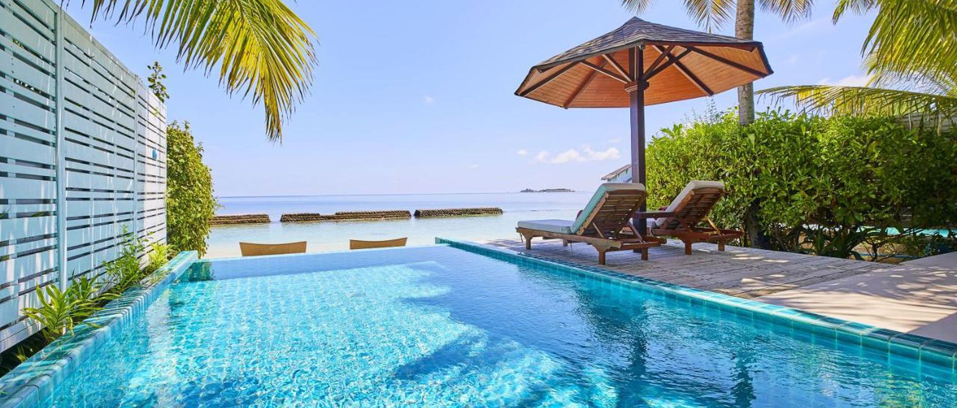 Красивый отель с дизайнерскими двухуровневыми пляжными виллами и с очень стильными виллами над водой.